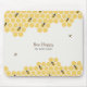 A mouse pad with a pattern of a bee on honeycombs on top and bottom and customizable gray and brown texts: perfect to make a gift to a beekeeper, a bee lover, a friend who loves nature, or just for your own family!