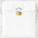 Bee Happy bumblebee. Cute quirky stickers with a black and yellow cartoon honey bee. It has a big oval yellow body with three black vertical stripes. His stinger is black and has light blue transparent wings. Two black feelers on his head and a cute happy face. The background is white but can be changed by clicking on customize and selecting the background colour of your choice.