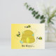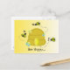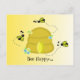 A cute design featuring a beehive with three little buzzing bees and flowers around it. Says 'bee happy'...