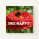Cute message to "bee happy" with a busy bumble bee collecting pollen from a bright red flower.