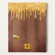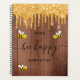 Decorated with happy, smiling yellow and black bumble bees. A brown wooden barn wall, country style as background. Decorated with faux gold glitter drips, paint dripping look. Black hand lettered script with swashes and the text: Bee Happy. Personalize and add your name and a year. Perfect for school, work or organizing your personal/family life.