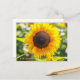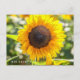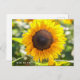 This postcard features a large sunflower field with a busy bee and the phrase "bee kind" in white, all-caps lettering.