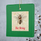 This bee wants to wish you a Merry Christmas. This design features a bee on a honeycomb background, with the phrase "Bee Merry" underneath. The background is a festive green.