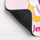 A mousepad with an adorable drawing of a pink and white striped bumble bee. A piece of yellow honeycomb behind. A letter sealed with a heart and a group of floating hearts are also part of the design. Editable text says: Bee Mine.