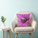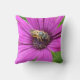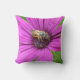 A throw pillow emblazoned with a little bee on a bright purple flower.