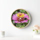 Stylish wall clock with white numerals that features the photo image of a fuzzy bumblebee on a beautiful, pink Zinnia flower. A fun, floral design! Use to decorate a living room, dining room, kitchen, bedroom, or any other room. Select your clock size and hand color.