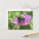 This postcard features a very sharp and colorful image of a bumblebee gathering nectar from a purple thistle blossom.