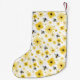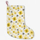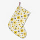 A Christmas stocking featuring a black and yellow pattern with illustrations of honey bees and flowers.