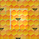 A swarm of honey bees over a seamless hexagon honeycomb grid pattern background with three dimensional shadows and highlights. Find a matching invitation, sticker, wrap around label, and related products in the collection. ©dotpattern