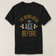 This black t-shirt features a humorous text design in orange and white that reads "I'VE NEVER BEEN THIS AGE BEFORE." The word "THIS" is centered above "AGE," which is flanked by decorative elements, creating a lighthearted birthday or aging-related statement..