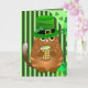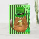 Are you looking for a funny / cute St Patrick's day card? Perhaps this card is the one you like to buy. This all around designed card shows on the front and inside left a funny, cute cat with a green top hat and drinking green beer. Around are shamrocks on a triped background. The text on the front and the inside card right text are template objects and can be changed easily into any other text you like. It is also possible to change the inside card background colors into any other color you like.