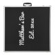 Create your own personalized regulation size beer pong table. The design is in the style of a bar sign illumination on a black background color. It has led neon wire light signage, which read BEER BEER BEER with illuminated beer bottles. The template is set up for you to add your name, bar name or family name and date established. Your custom text is printed in white, casual lettering. The beer pong table has a design at each end of the table, to face each team, in a color palette of black pink purple, green and blue. Great design for your bar or man cave and a great drinking party game for a housewarming, boys night out or house party.