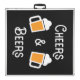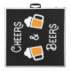 Regulation beer pong table with beer theme, in black and white. The design features cool vintage typography with glass jug tankards filled with beer and topped with a beer head. The wording reads "Cheers & Beers". The table also has a circle pyramid, representing your pong cup placement guide, at each end of the table. Smart, stylish and simple. As far as party drinking games go, the cup pong game is one of the most popular, fun drinking games for small groups. Please browse our store for alternative colors and designs.