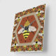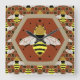 This cute pattern features a graphic motif of busy bees in black and yellow set against a stylized honeycomb design in warm orange and brown hues.
