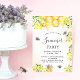A summer party invitation with a white and golden watercolored background. Decorated with bumble bees, melting honey and honeycomb with yellow florals, flowers and a honey jar. Personalize and add a name and party details. Golden and black letters. Perfect for a summer or fall party.
