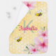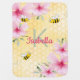 A golden background with a bee honeycomb pattern and happy smiling bumble bees. Decorated with pink tropical Hibiscus florals, flowers and greenery. Personalize and add a name and monogram letter, green and hot pink colored letters. The name is written with a hand lettered style script.