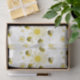 This charming tissue paper design features a delightful scattering of stylized daisies in soft white with sunny yellow centers. Playful bumblebees, rendered in cheerful yellow and black stripes with delicate white wings, buzz around the blossoms. Tiny yellow dots are sprinkled across the gentle gray background, adding a touch of whimsical sweetness to the overall design. Perfect for adding a touch of springtime joy to any gift or packaging.