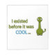A funny green dinosaur, with a friendly look and a funny message: I existed before it was cool. This is a joke referring to the fact that dinosaurs lived before the Ice Age and also a great way to show to someone how cool and wise you are.