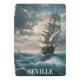 A tall, wooden sailing ship from a previous century sails under a threatening sky and on heavy seas. A beautiful iPad cover that's perfect for anyone who loves sailing and the sea. Personalize with your name at the bottom.