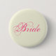 Beige and pink Bride button in cool lettering .Great for wedding rehearsals ,wedding showers, receptions or any other event before or after tying the knot .