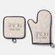Beige and white modern geometric minimal personalized home decor oven mitt and pot holder set.
