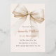 A soft beige, cream colored background, decorated with a large bow. Personalize and add a name and party details. The name and age are written with real rose gold foil.