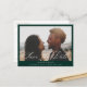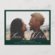 Beige calligraphy overlay, photo wedding save the date postcard. Emerald green background on front, coordinating white background on back with dark beige typography. Card features elegant beige calligraphy "Save the Date" graphic on front and back. Elegant and trendy monochrome style design.
