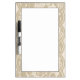 The board is very high quality and heavy! We wanted to put it on our fridge, but there was no way to attach it with magnets. We tried bag clips with magnets, but the board was still heavy after using 4. We purchased a roll of magnetic tape. Adhesive on one side, magnet on the other. Works great. Other problem is that it comes with a black dry erase marker. Why not an option to choose a white one? Had to purchase a chalk dry erase marker from Amazon, but after all that, board works great! Wife loves it. Printing is beautiful. We went with stock except changing to our last name. Looks great!