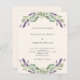 A beige colored background decorated with purple lavender flowers and eucalyptus greenery. Personalize and your names and details.