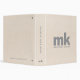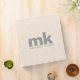 This design features a light beige linen texture, an oversized two-letter monogram, and a full name in the suggested gray font color.