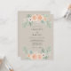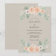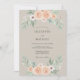 This design features a soft, romantic watercolor aesthetic with a focus on natural elegance. A muted tan backdrop provides a warm, vintage feel for the delicate peach and cream floral arrangements. Lush peach roses are paired with dainty white anemones and silvery sage green eucalyptus leaves. These symmetrical floral clusters create a balanced and sophisticated botanical look.