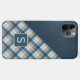 Contemporary tan, brown, beige, taupe, and dark teal blue colored tartan plaid, and a faux leather texture pattern background. With room to customize or personalize with a name monogram or initial of your choice. Beautiful, modern, and cool cover for the trend-savvy and art-loving hip trendsetter, artsy motif lover who wants to protect their phone from dust and dirt, wear and tear. This design is available in Apple iPhone 6, 7, and 8 Plus, 10 or X, XR, XS, 11, 12, 13, 14 Mini, 15 Plus, and Pro Max cellphone cases. Show off your style, look fashionable, and feel stylish with a unique design on a mobile device accessory of your choice.