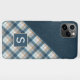 Contemporary tan, brown, beige, taupe, and dark teal blue colored tartan plaid, and a faux leather texture pattern background. With room to customize or personalize with a name monogram or initial of your choice. Beautiful, modern, and cool cover for the trend-savvy and art-loving hip trendsetter, artsy motif lover who wants to protect their phone from dust and dirt, wear and tear. This design is available in Apple iPhone 6, 7, and 8 Plus, 10 or X, XR, XS, 11, 12, 13, 14 Mini, 15 Plus, and Pro Max cellphone cases. Show off your style, look fashionable, and feel stylish with a unique design on a mobile device accessory of your choice.