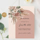 A modern, stylish and romantic Save the Date card for a wedding. Cream, peach colored background, an antique rose colored arch frame, it’s beautifully adorned with muted, earthy roses, eucalyptus greenery, and pampas grass for a natural and romantic feel. Personalize and add the date, your names.