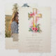 Beige Watercolor Style Pastel Floral Cross-Shape Christian Wedding Invitation Cards with Back Photo and QR Code.