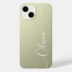 Beige Shimmer White Elegant Calligraphy Script Custom Personalized Name iPhone 14 Smart Phone Cases features a modern and trendy simple and stylish design with your personalized name in elegant hand written calligraphy script typography on a metallic beige shimmer background. Designed by ©Evco Studio www.zazzle.com/store/evcostudio