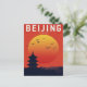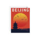 Capture the dramatic beauty of the Chinese capital with this bold, graphic travel postcard for Beijing, China. The striking illustration features the silhouette of a traditional Chinese temple or pagoda set against a massive, glowing orange and red sunset. Birds fly across the sky, adding dynamic movement to the landscape. This card is perfect for those who love Asian travel, dramatic color palettes, or collecting retro-style posters celebrating the iconic landmarks of China.