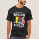 My 11 yo wore adult XL (5’7” 165#). The 8yo is small framed. She wore adult small and tied it in the back. Grandma wore adult large with long sleeve shirt underneath. Tall girl adult medium. Dark haired male adult large. Good quality dark Heather gray, Gildan brand shirt. -it was next up from basic choice and cost about $20 per shirt. Not too thick or thin. Washed and dried well, no major shrinkage. Not see-through. Can wear a bra under it fine. Screen print is just as shown and well done, front and back.