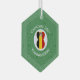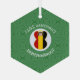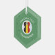 Christmas decor featuring an angel dressed in the flag of Belgium on this hexagon glass ornament for the holidays. The Belgian angel flies inside a circle of white squiggly squares, surrounded by a background of green squiggly squares for Christmas. To personalize, add a name. To customize, add a year. Or, add your own text.