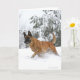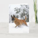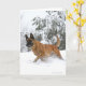 An energetic Belgian Malinois enjoying a snowy day on a greeting card.