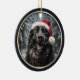 On the front of this Holiday ornament is a beautiful portrait of a black Belgian Sheepdog Dog wearing a red and white Santa hat in front of snow covered winter pine trees. The image is framed in shiny gold and dark blue. The back of the ornament has your custom text in gold.
