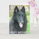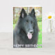 Greetings card featuring a funny portrait of Belgian Shepherd dog. Front text reads "Happy Birthday", inside text reads "Hope you have a great day!" Text can be customised.