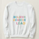 Believe Achieve Lead" is printed in a vibrant, multicolored font, showcased on a soft cotton T-shirt in a professional, eye-catching design.