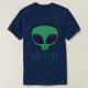 Cartoon alien head illustration with big dark eyes with "Believe" lettering.