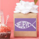 A Christian fish symbol with the word "BELIEVE" in white text on a lavender background.