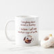 "Everybody should believe in something. I believe I'll have another cup of coffee." A funny coffee mug quote perfect for any coffee lover! Elegant handwritten style text over a stylized image of a steaming coffee cup and coffee bean in purple and brown.