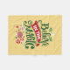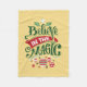 A blanket with a cool illustration. Text says Believe in the Magic in fancy lettering. Decorated with christmas balls.