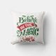 Pillow with a cute illustration. Text says Believe in the Magic in fancy lettering. Decorated with christmas balls.