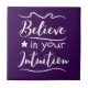 Add a personal touch with a custom-made ceramic tile. Believe In Your Intuition Quote Inspirational Purple and White on a Decorative Ceramic Tile. The tile is perfect for adding a unique style to your home decor, whether you use it as a coaster, a wall hanging, a trivet, on a bathroom wall, or as a kitchen backsplash. Available in two different sizes. Great gift idea.