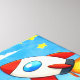 Supporting icons like a smiling sun, a mountain peak, an open book with a magnifying glass, and multiple colorful rockets.